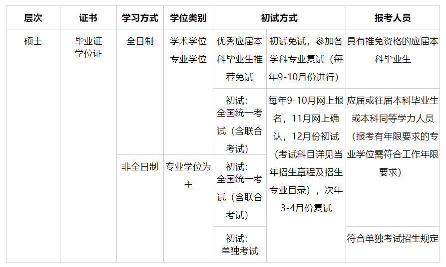 全国硕士研究生招生考试初试方式分为全国统一考试(含联合考试)、单独考试以及推荐免试。