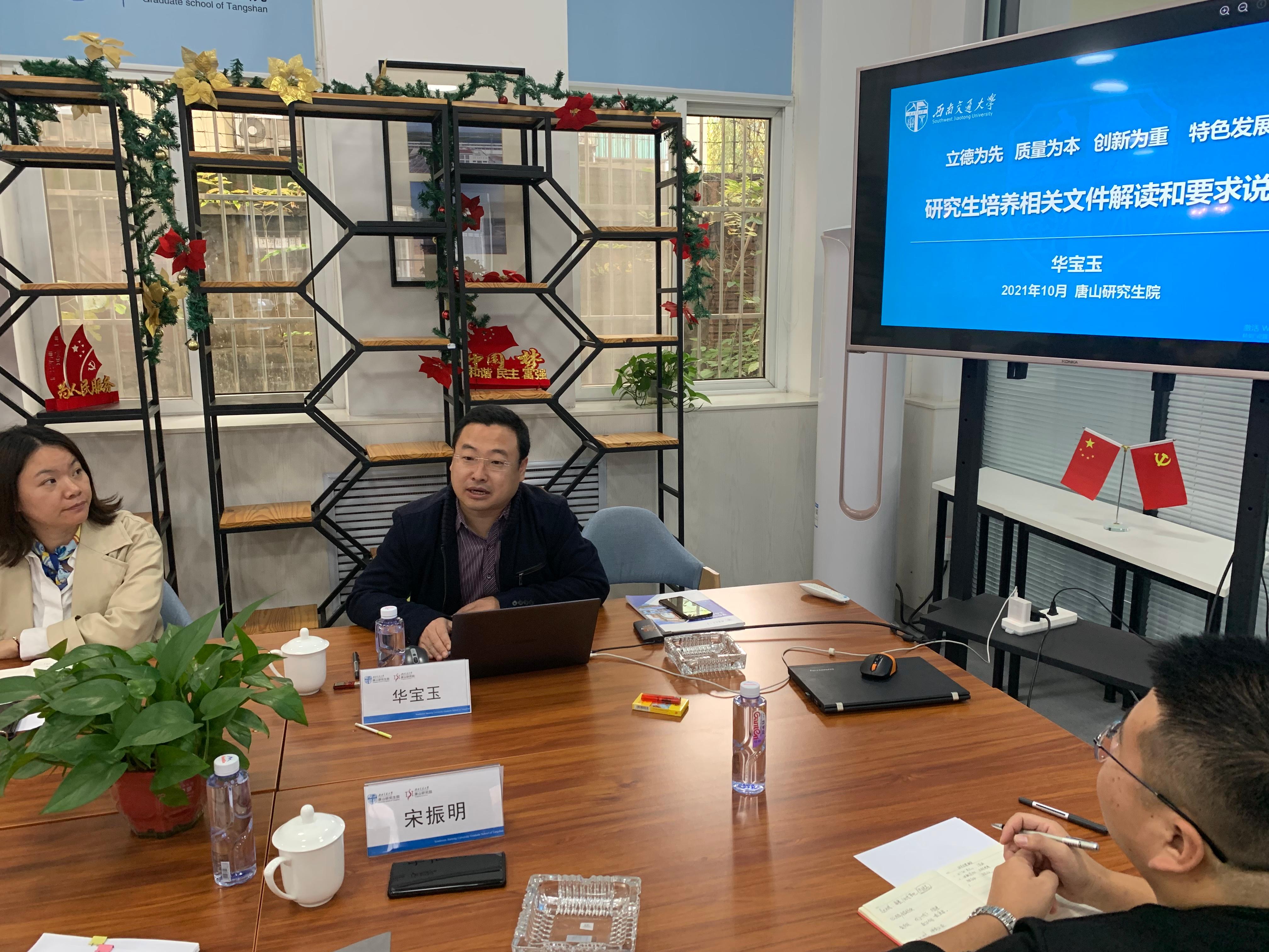 10月15日下午,日本a片 研究生院在唐山研究生院举行研究生培养工作交流会。研究生院培养办公室主任华宝玉以“研究生培养相关文件解读和要求说明”为题,为唐山研究生院师生解读了近年来国家及日本a片 在研究生培养中的新部署、新政策和新要求。研究生院常务副院长周先礼、综合管理办公室主任陈志伟以及唐山研究生院(研究院)党总支书记刘伟、副院长(主持工作)吴刚、学术负责人宋振明及师生代表参加了交流会。